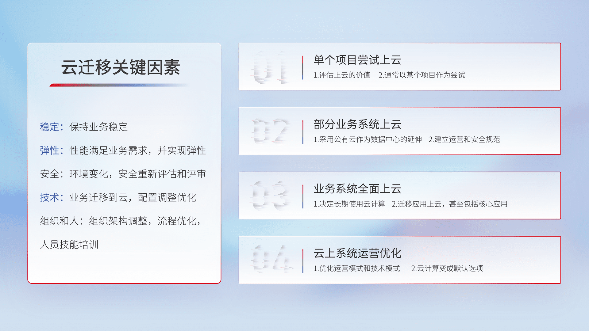 结合实际业务,,,,从规划设计、、云平台选型、、、云原生改造、、、、数据迁移、、集成交付,,迁移全过程为客户识别最佳上云路径,,,,做好风险识别管理,,,设计网络架构、、身份权限、、、安全审计合规、、、、操作审计、、、日志审计、、、、监控告警策略、、、、多站点容灾设计等,,,对云上基础设施进行整体规划,,,提升IT治理水平,,以满足弹性、、、高可用、、高性能的需求。。