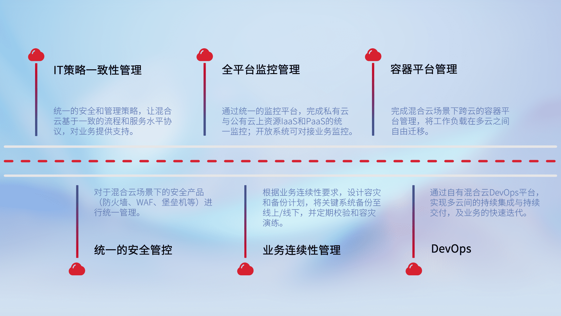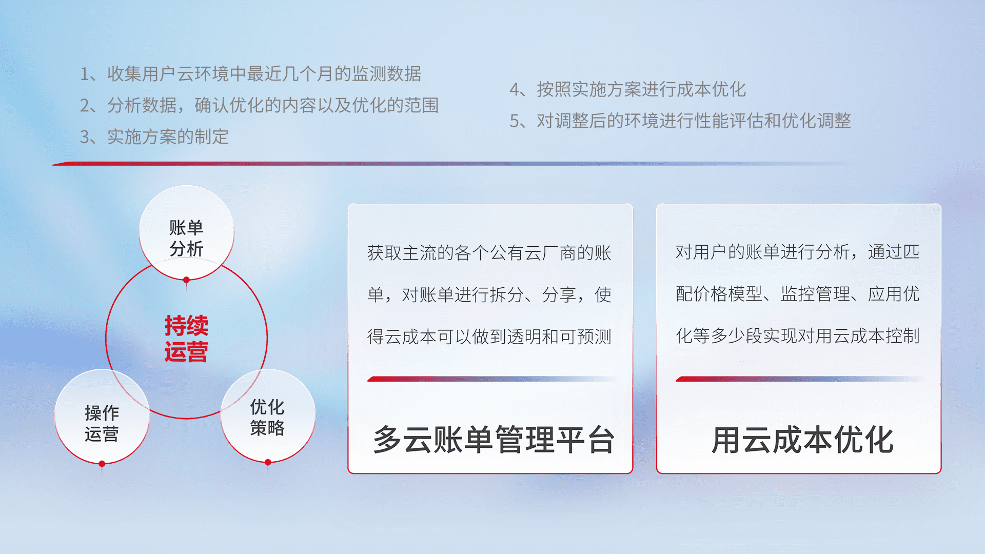 通过多云纳管,,以统一的资源数据模型把客户的云资源进行抽象和封装,,进而实现对多云资源的统一操作,,,,保障云资源管理的可靠性、、、稳定性与可用性。。。量身定制化运维内容,,配置、、开发运维、、、补丁管理、、备份、、监控、、认证和访问管理、、、审计和日常巡检等,,保障在用云过程中的可靠度,,,稳定度以及高可用率。。。